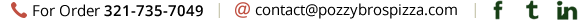 Pozzy bros. Pizza We are 3 Brothers that have worked in some of the finest pizzerias and Italian restaurants Central Florida has to offer. We expect nothing but the best out of ourselves and that style of pride shows most in our cooking and customer service. Here at Pozzy bros. pizza we believe in using fresh quality ingredients in our homemade recipes to insure you have an extraordinary meal every time you visit us. Thank you for your support and we hope to be able to serve you for a lifetime.
